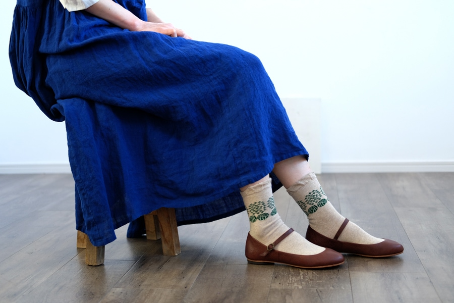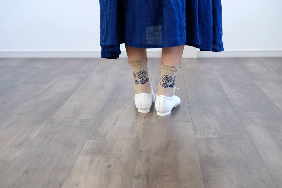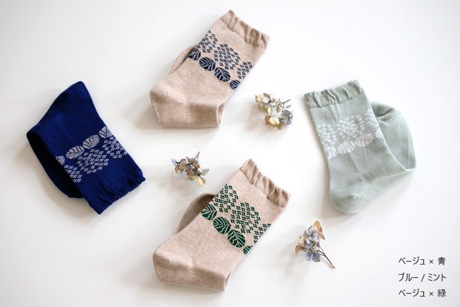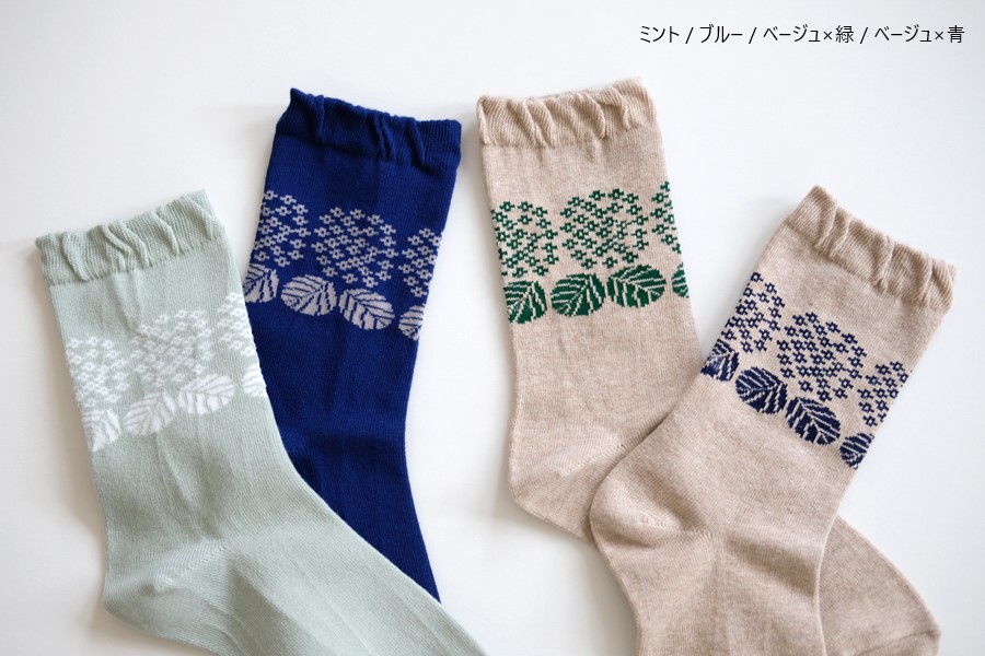 足首まわりにぐるっとアジサイの花をあしらった、個性が光る靴下です。