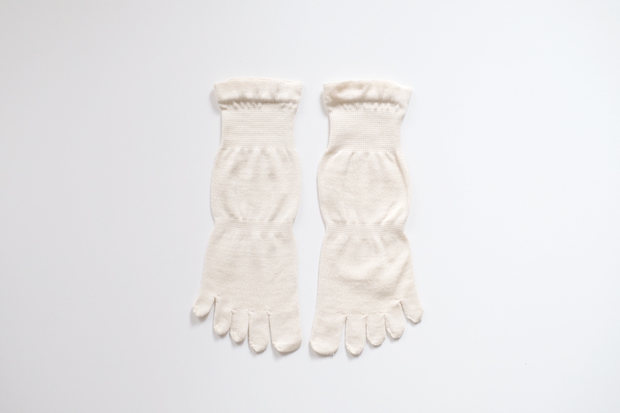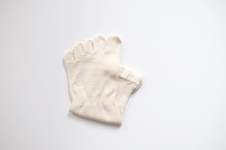 1枚目のシルク5本指には、ズレ防止のサポートを2か所入れて編みました。