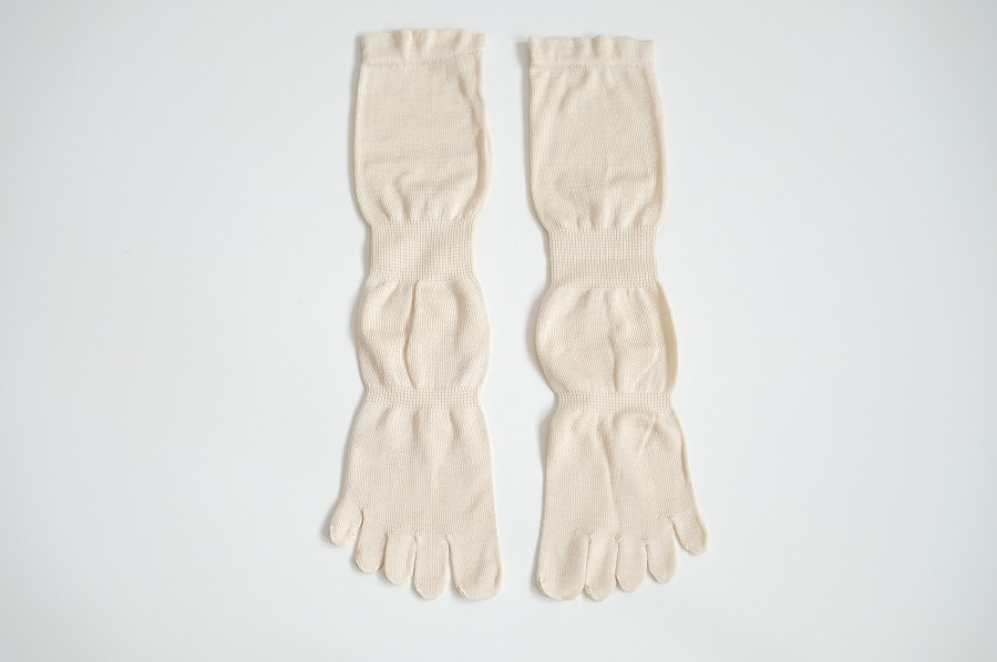 1枚目のシルク5本指には、ズレ防止のサポートを2か所入れて編みました。