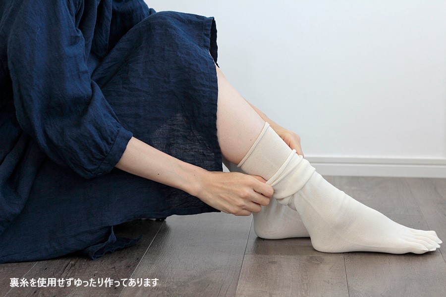 裏糸(ポリエステル・ポリウレタンなどの化繊)を使用せず、ゆったり作ってあります。また、どんな足のサイズ(大人)の方にも合うように、かかとがないものになっています。