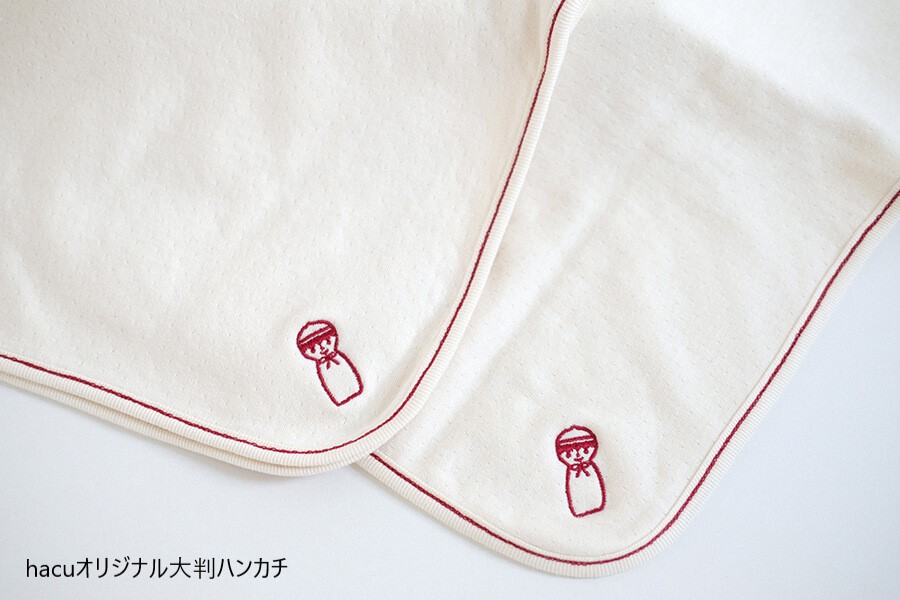 yubiちゃんのイラストを刺繍した100%オーガニックの大判ハンカチは、日本オーガニック協会の製品認定を受けているニットナゴヤさんとのコラボ商品。