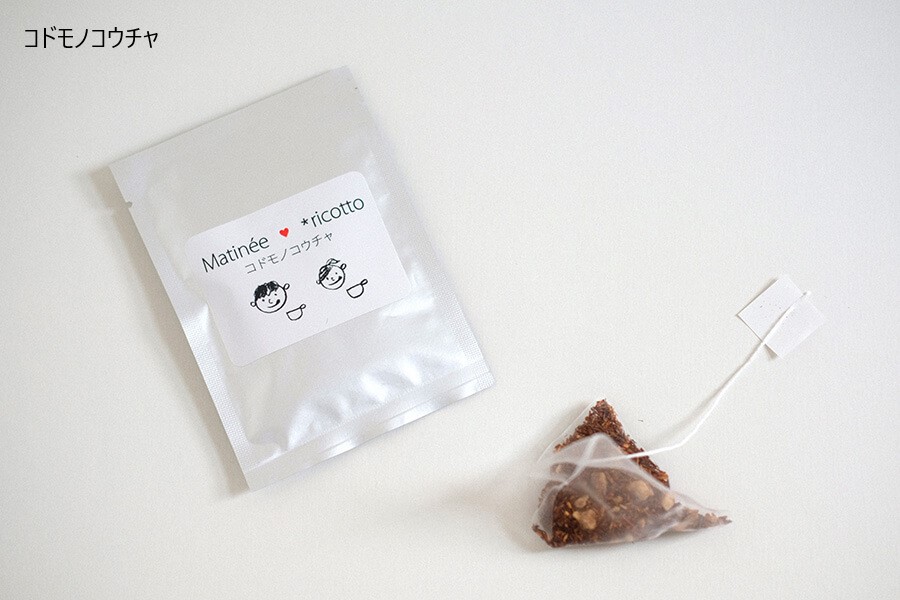 *ricottoさんと紅茶専門店Matineeさんのコラボによる、ルイボスティーにメイプルシュガーがブレンドされてた、ほんのり甘い「コドモノコウチャ」。