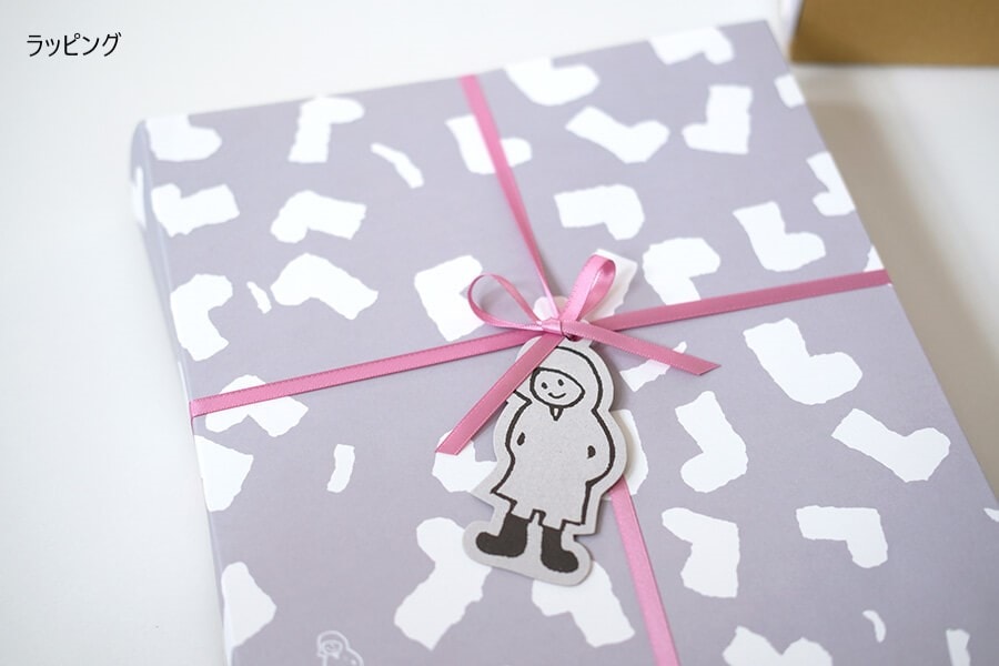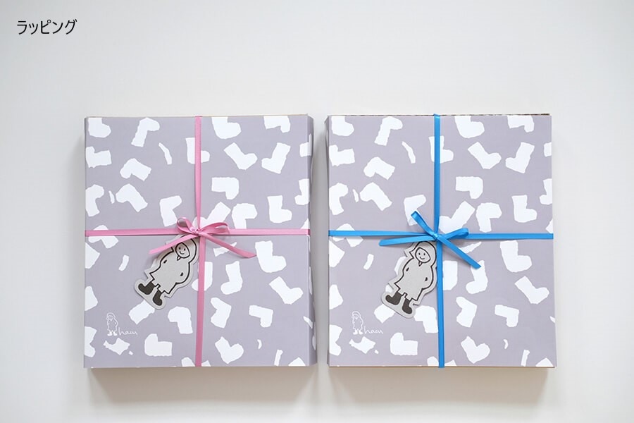 靴下の形の窓から中身が見えるインナーボックスに、靴下の柄がアクセントのペーパーをかぶせて可愛くラッピングしてお届けします。