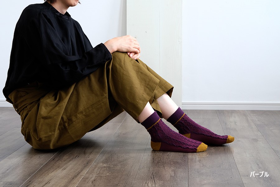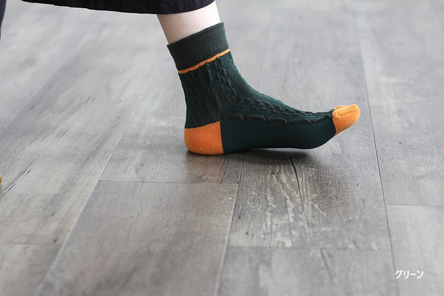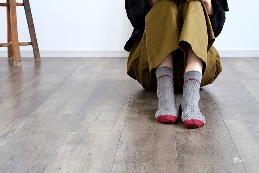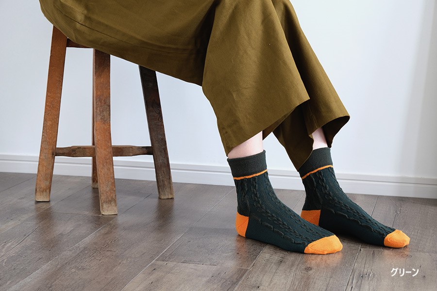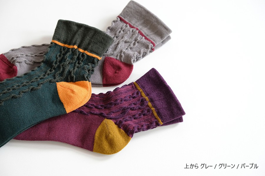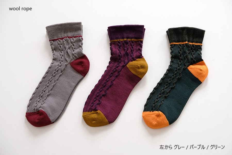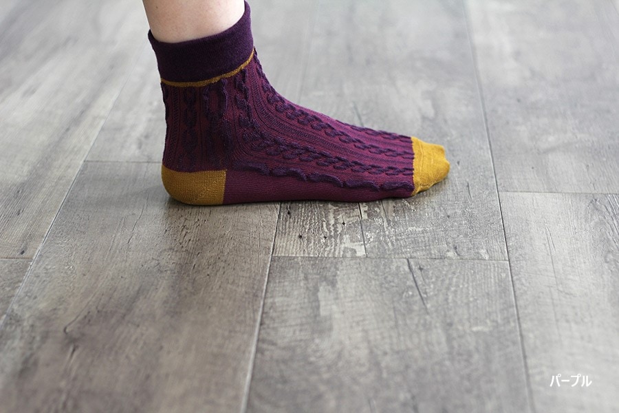 大小の浮き出たロープ編み柄が、かわいいショート丈の靴下です。