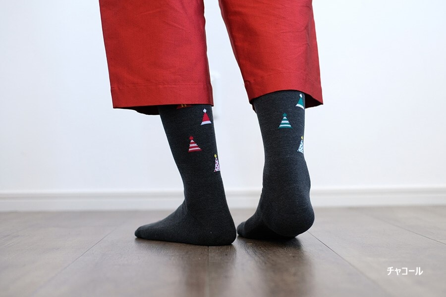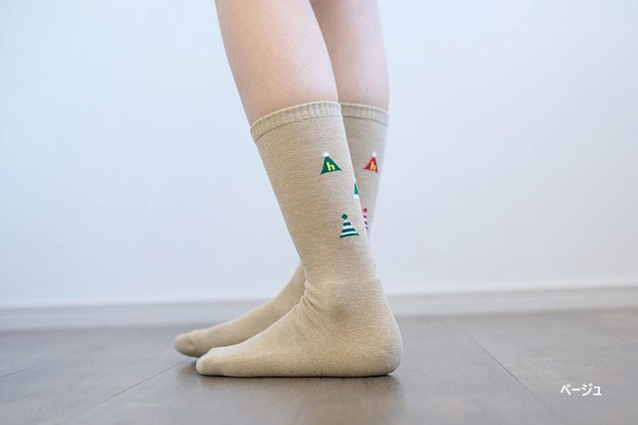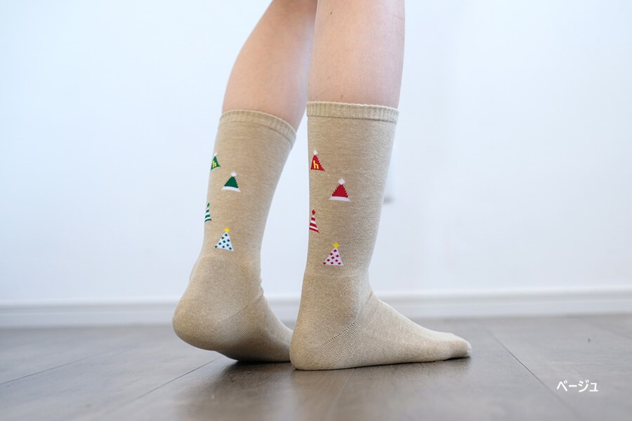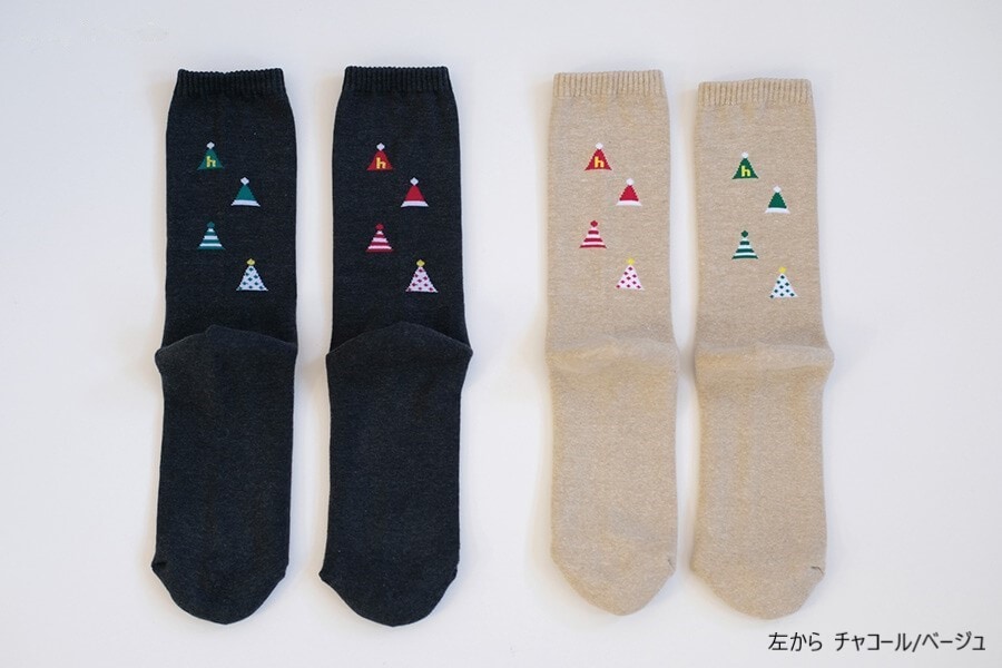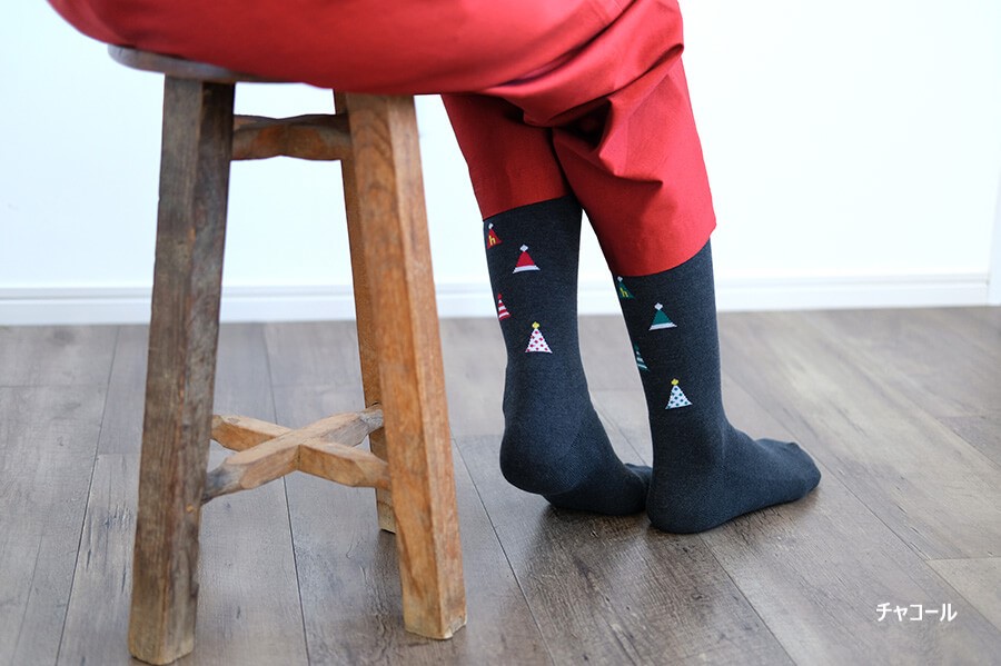 左右色違いの三角帽子柄が楽しいパイルソックス。