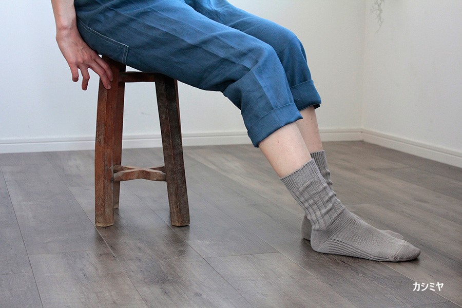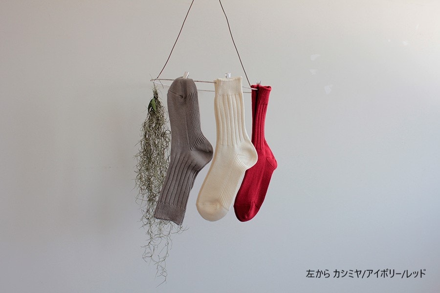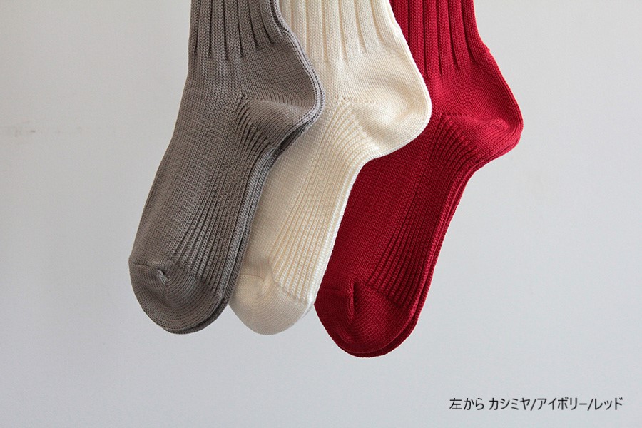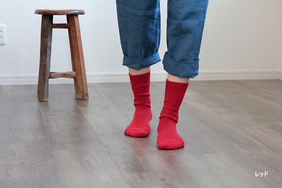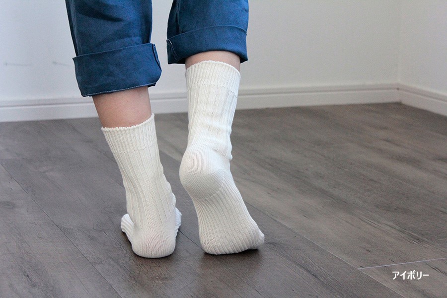 綿糸を撚ってざっくり厚地で編立てたリブソックスです。