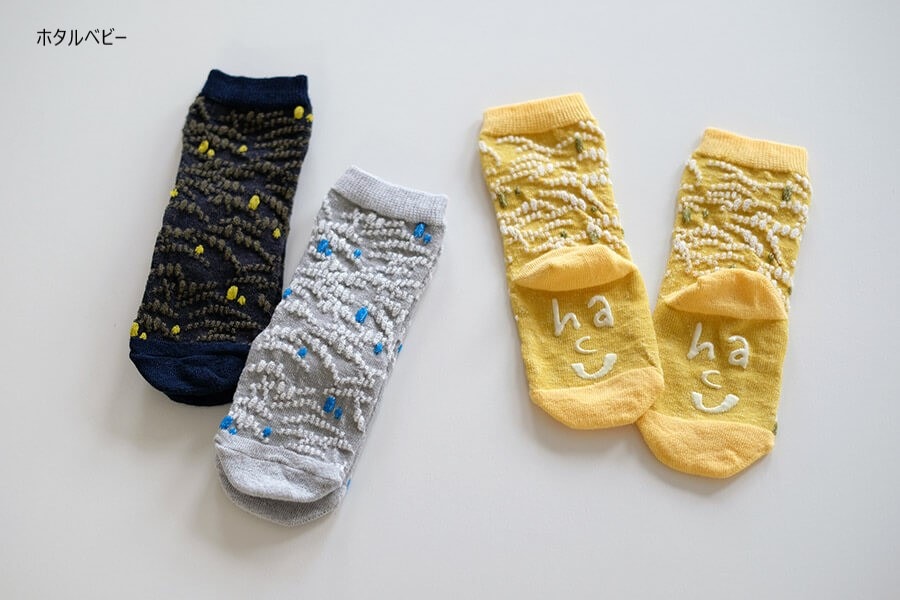 肌触りのよい綿麻糸を使い編立てています。ポコポコした緩やかな弓状の柄は草原の草をイメージ。そこに浮遊するホタルを描きました。
