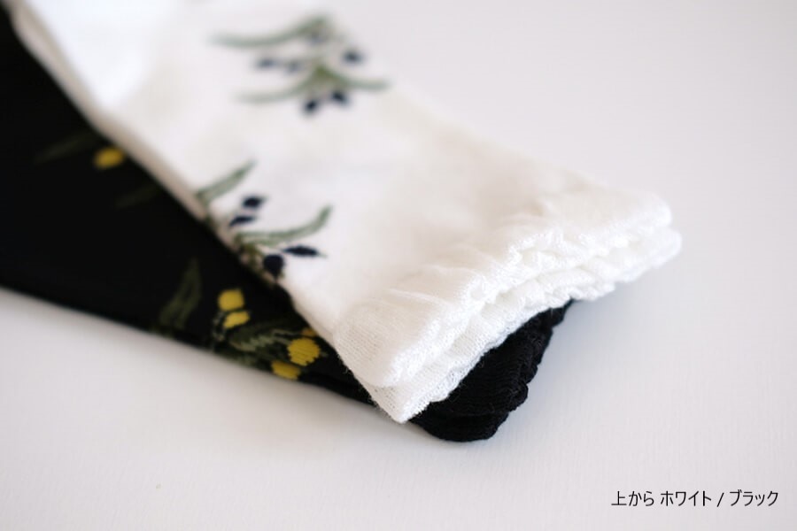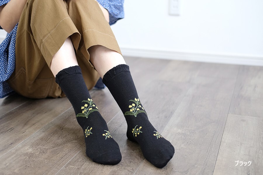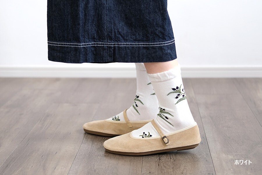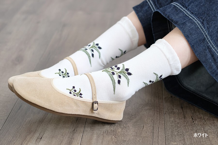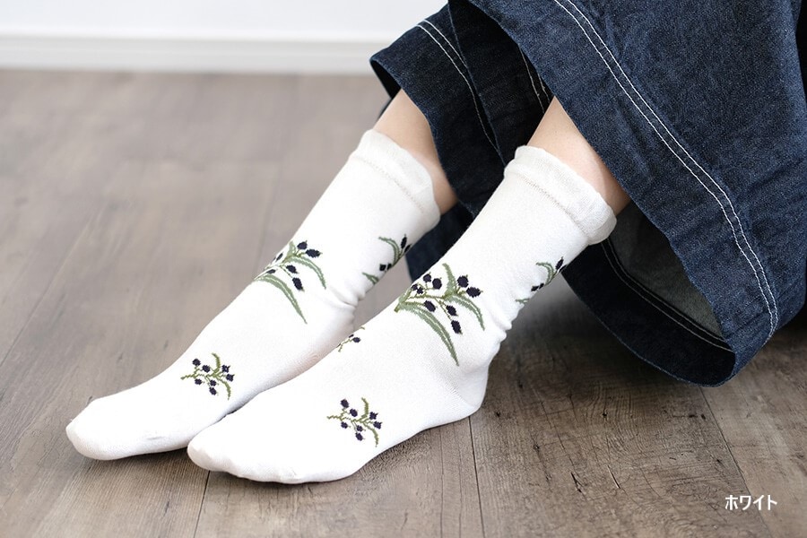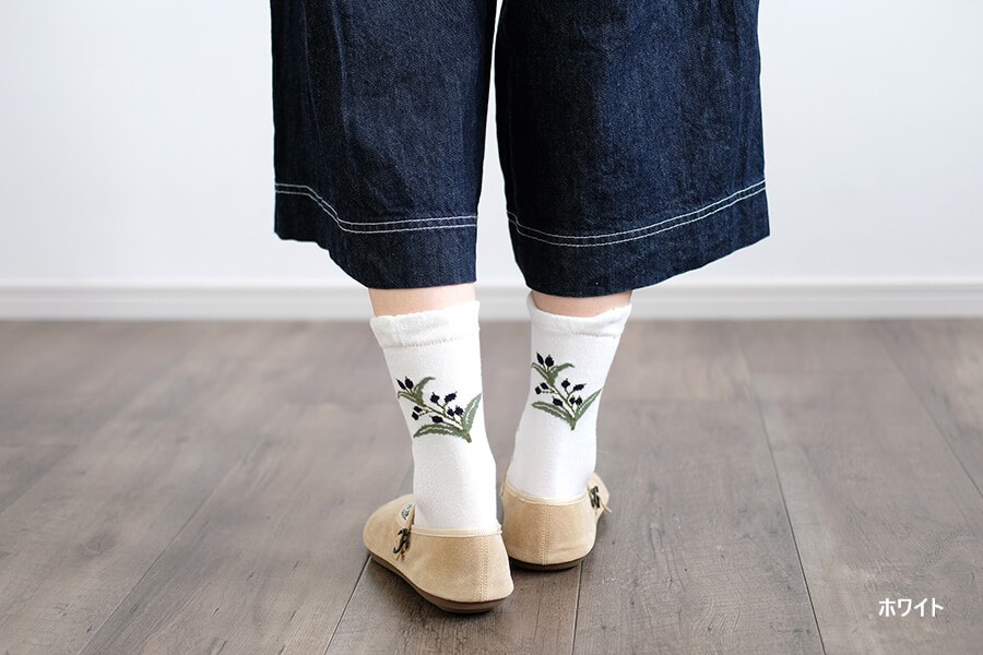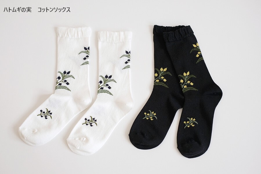 汗ばむ季節に快適に履けるように、コットン素材で、ハトムギの柄の色もカラーを使用したので、かわいい雰囲気の1足に。履き口もフリルに、やさしい履き心地はもちろん、程よいフィット感もある靴下に仕上がりました。