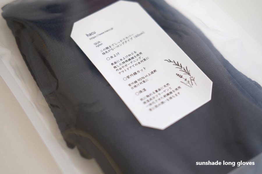 虫よけ、紫外線カット、保湿を兼ね備えたsunshade long gloves。つなぎ目なし、薄手でゆったりとした着け心地。長さが60センチありますので、袖の短いTシャツやブラウスを着た時に肌を露出せずしっかりカバーできます。