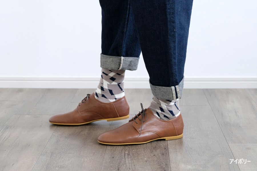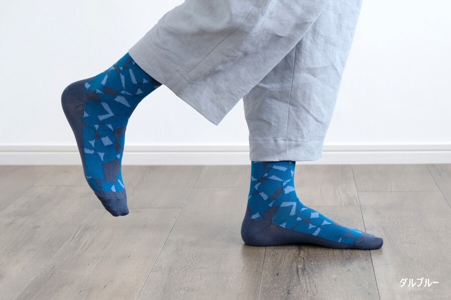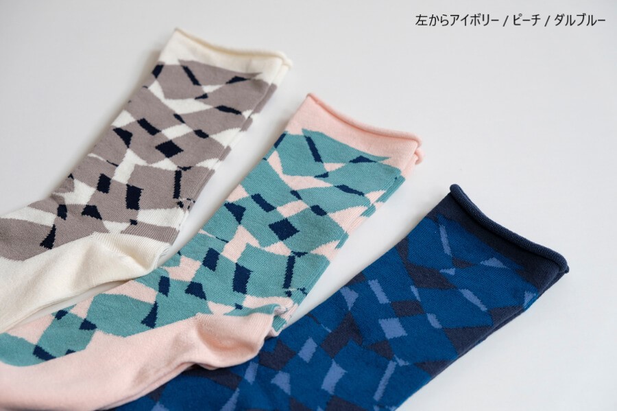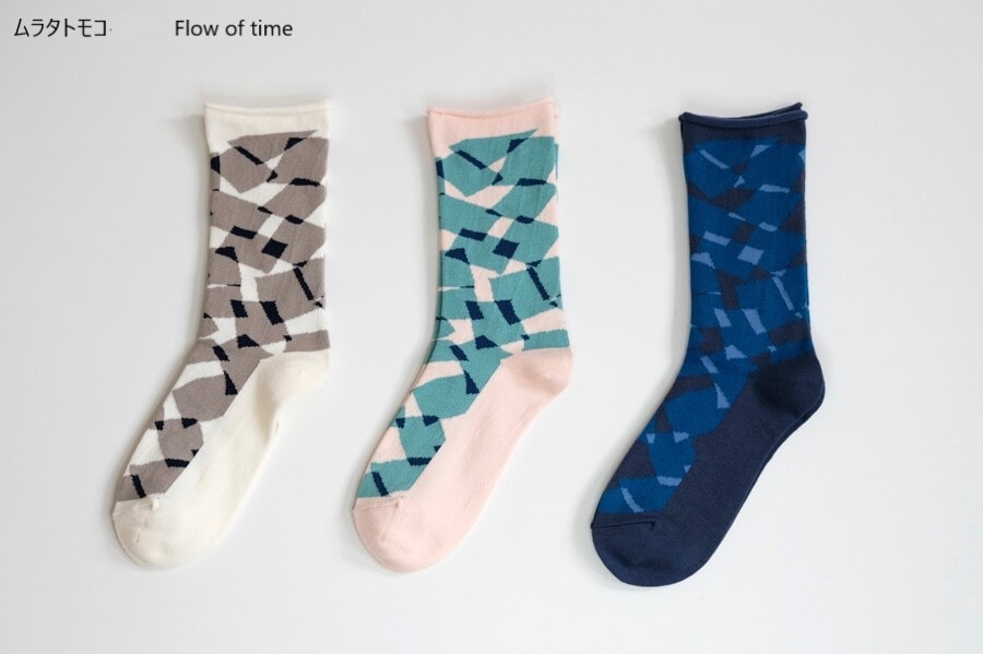 flow of time(時間の流れ)と名付けたこの靴下は、ゆったりと過ぎゆく時の流れをイメージしてデザインされています。