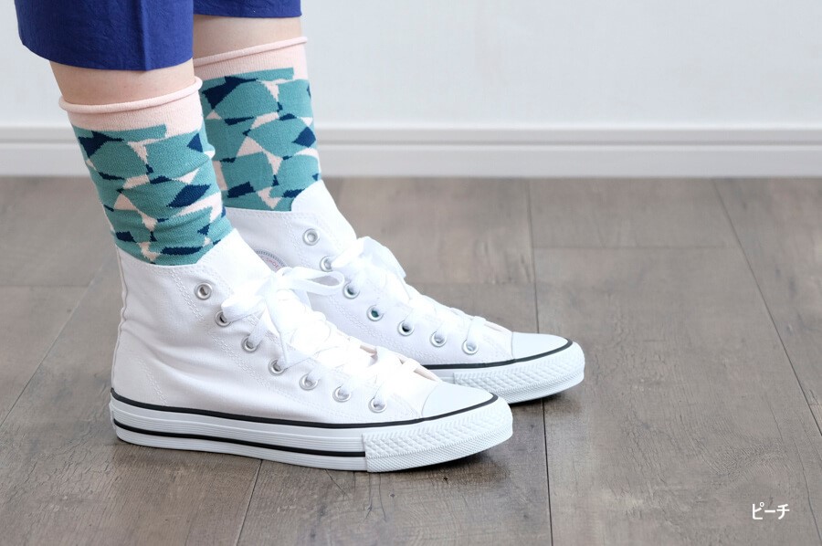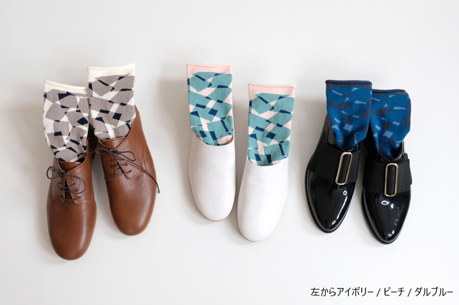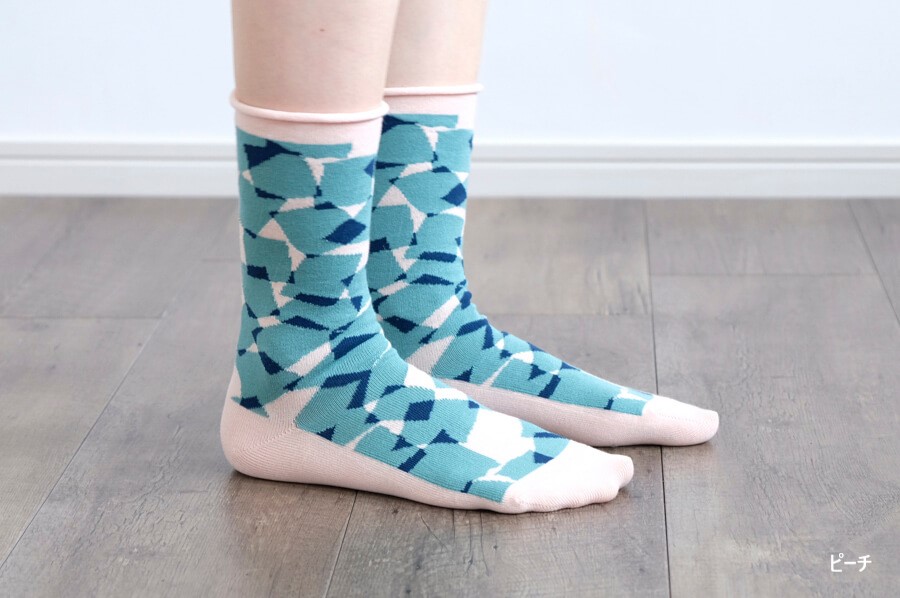 有機的な幾何学模様で、シンプルながらも遊び心のある図案が、足元をパッと引き立てます。