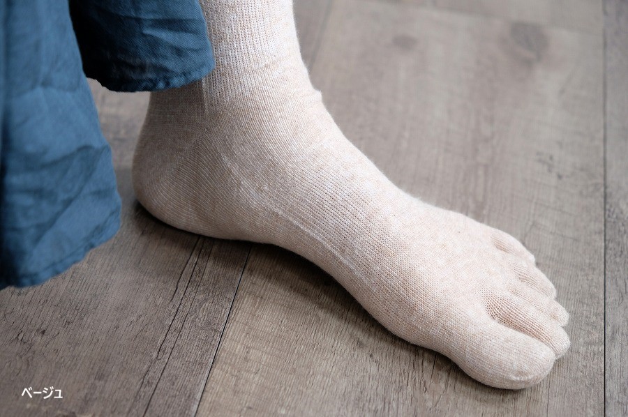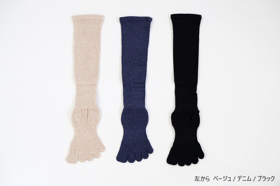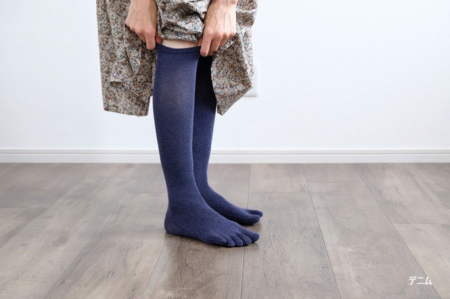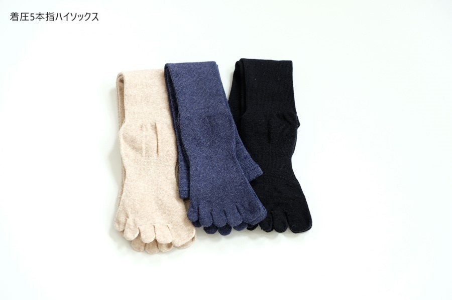 5本指の着圧ハイソックスで、足の下から上に向かって血行が促されるように、5段階の圧力設計をして編み立てています。