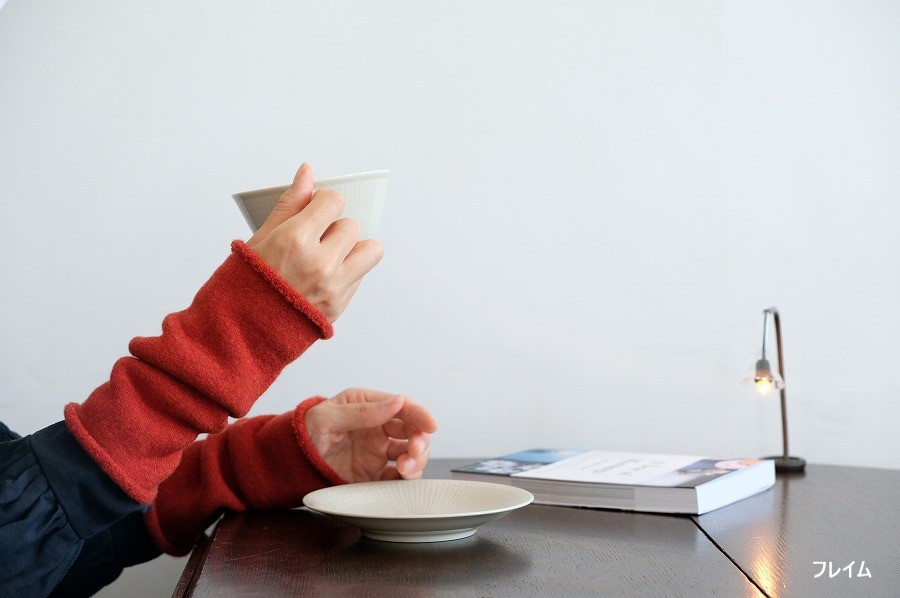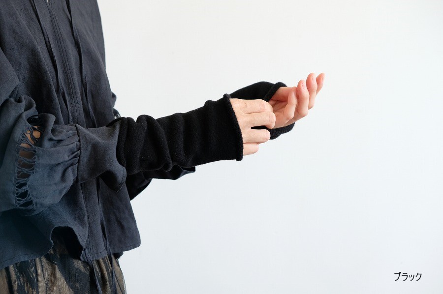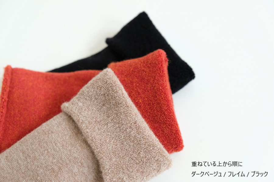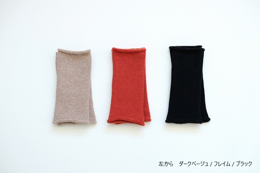 防縮加工をしたメリノウールでやさしく編立てた、パイルのリストウォーマーです。