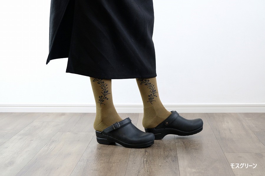 足の両サイドに施したデザインは、ハトムギの葉と実の連なりのシルエット。可愛らしすぎない柄なので、シンプルな装いにさりげないアクセントを与えてくれます。