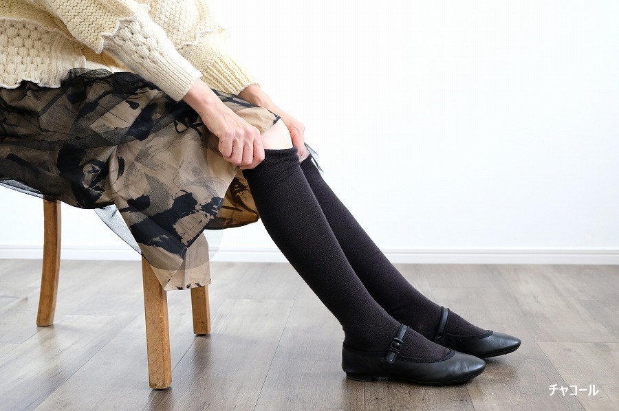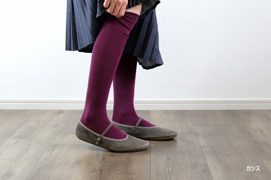 履き口にゴムが無く、締め付け感がないのに程よくフィット。ぎゅっと伸ばすとひざ上までくる丈ですが、ひざ下までの丈で履くのが、ハッピーソックスのおすすめです。