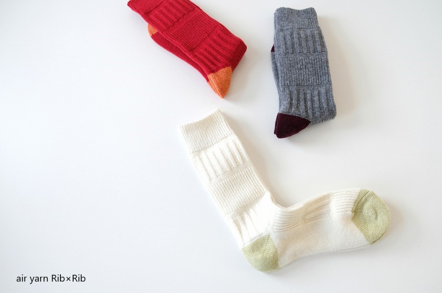 繊維の中に空気を多く含んだ、特殊紡績軽量ウール混糸で編立てたソックス「air yarn Rib×Rib」。