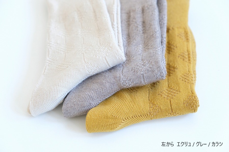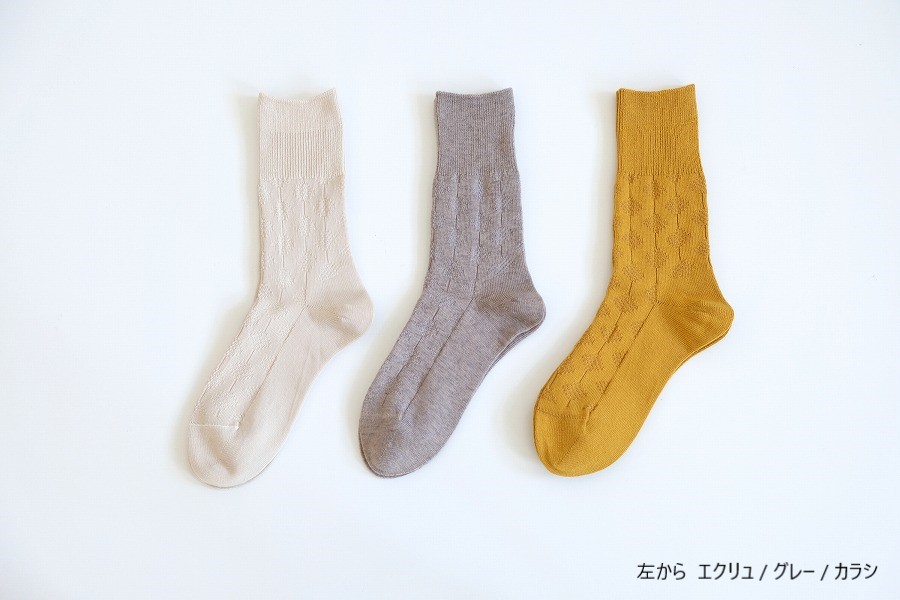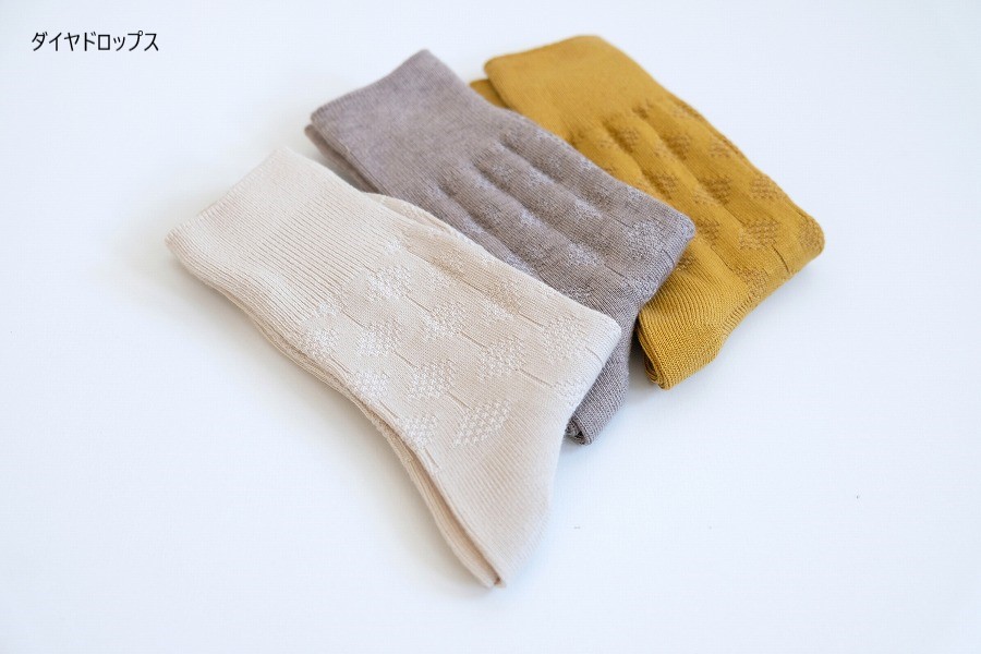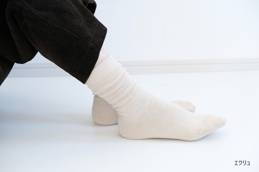 ダイヤ形が連なった滴のようなデザインで、ややレトロ感漂う柄が足全体を包みます。