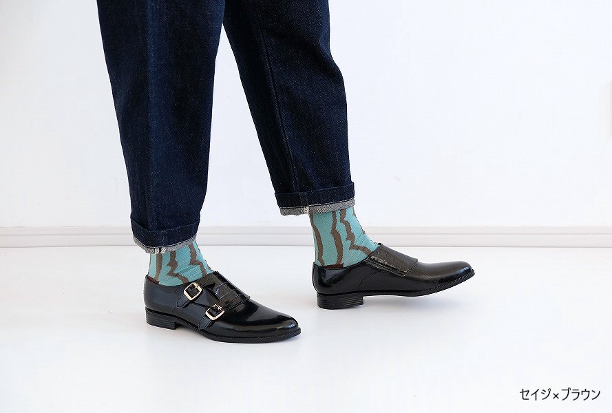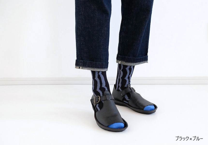 瀬戸内のどこまでも穏やかに続く、煌めくさざ波をイメージしたデザインで、不規則に描かれた波柄とつま先と、かかとの配色とのバランスが目を惹きます。