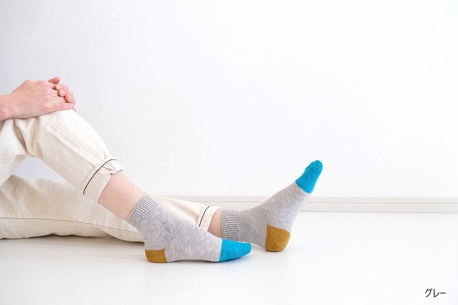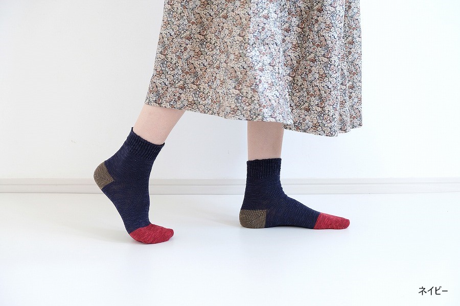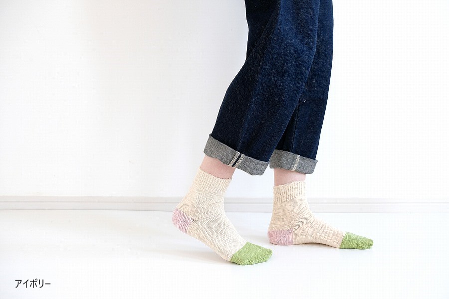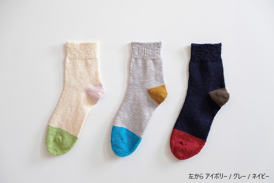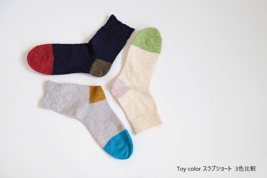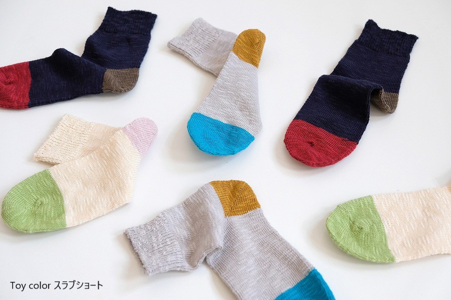 「Toy color スラブショート」は、糸を撚る際にあえて糸の太さを均一にしない「スラブ糸」を使って編み立てた、ショート丈の配色靴下です。
