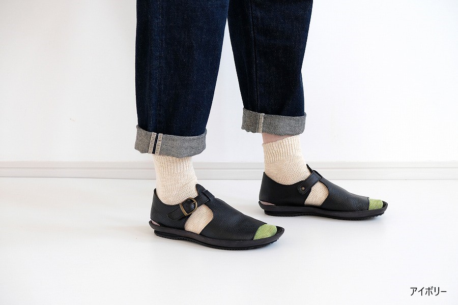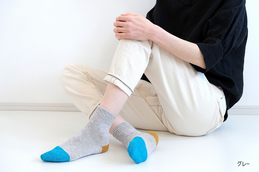 つま先の配色部分を大きく取り、かかとの配色にもこだわった個性的なデザインは、足元を軽快にポップに彩り、サンダルやスニーカーにも合うカジュアルな靴下です。