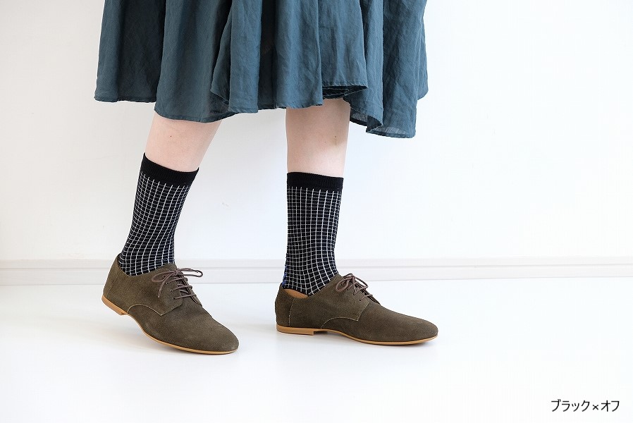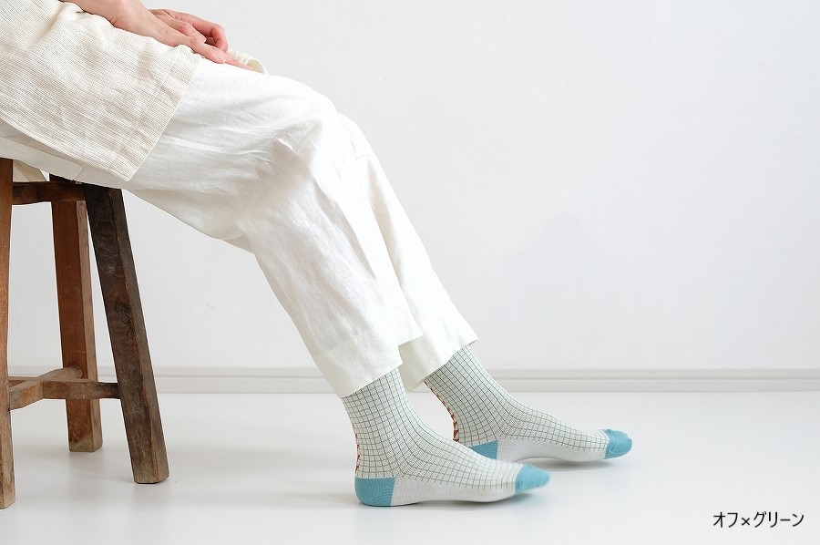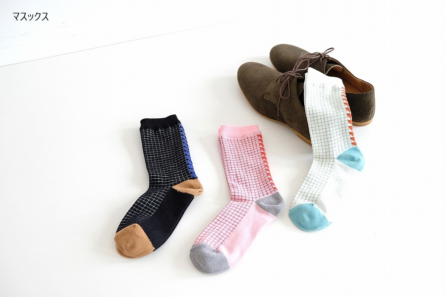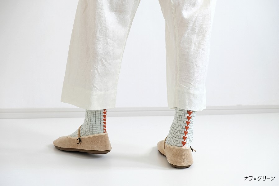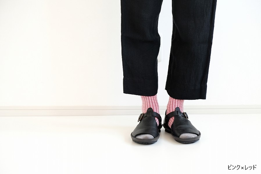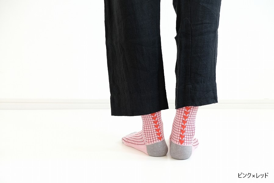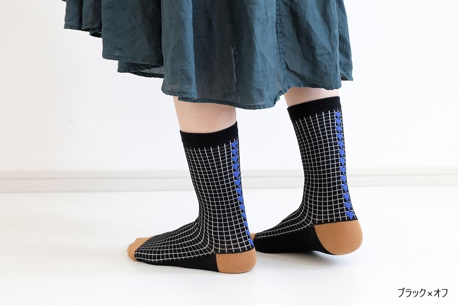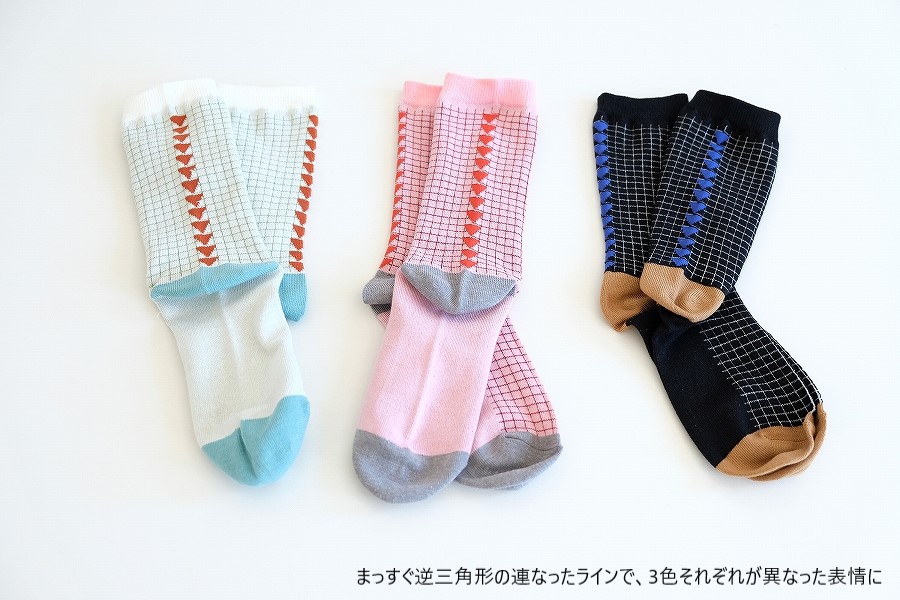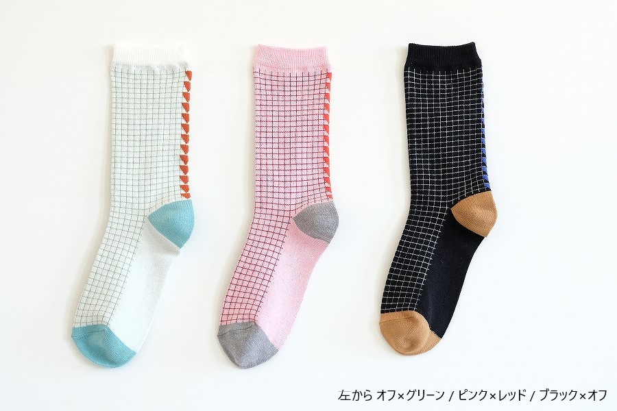 パッと目を惹く、ポップなマス目地模様で可愛さを、つま先かかとの配色にもこだわり、ポップさをアップさせました。