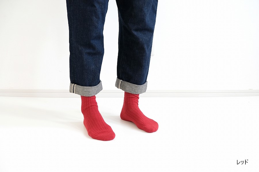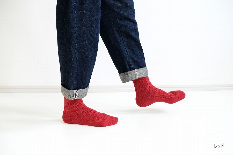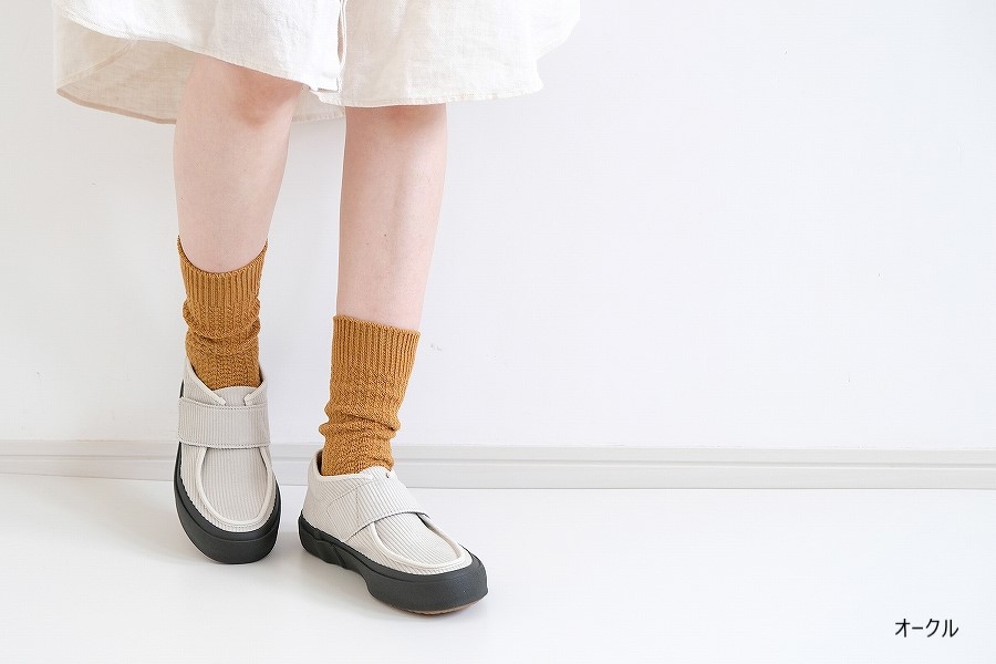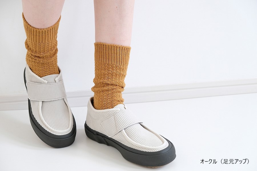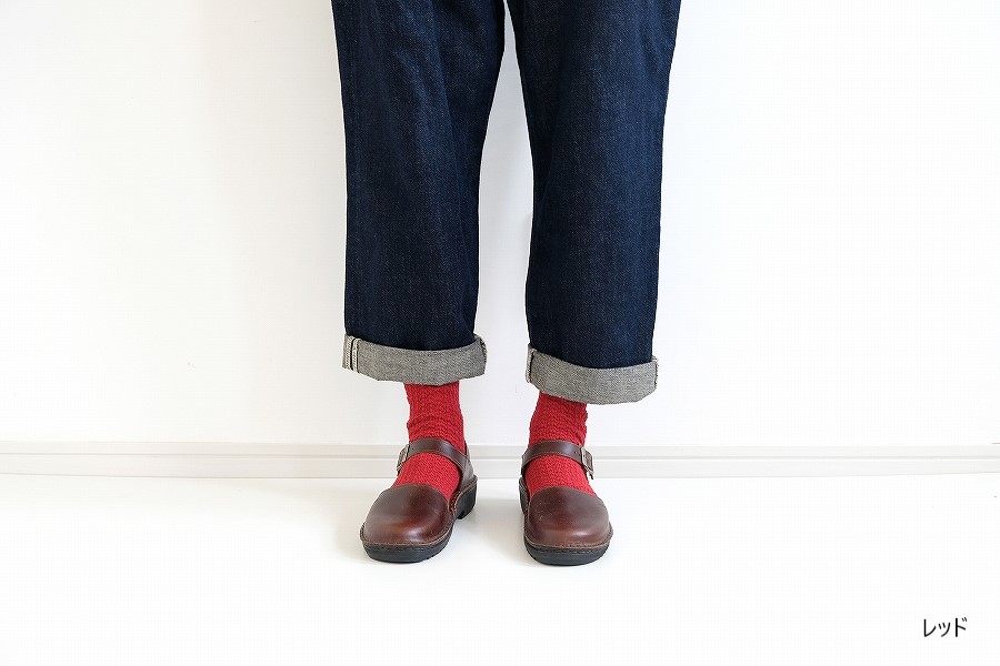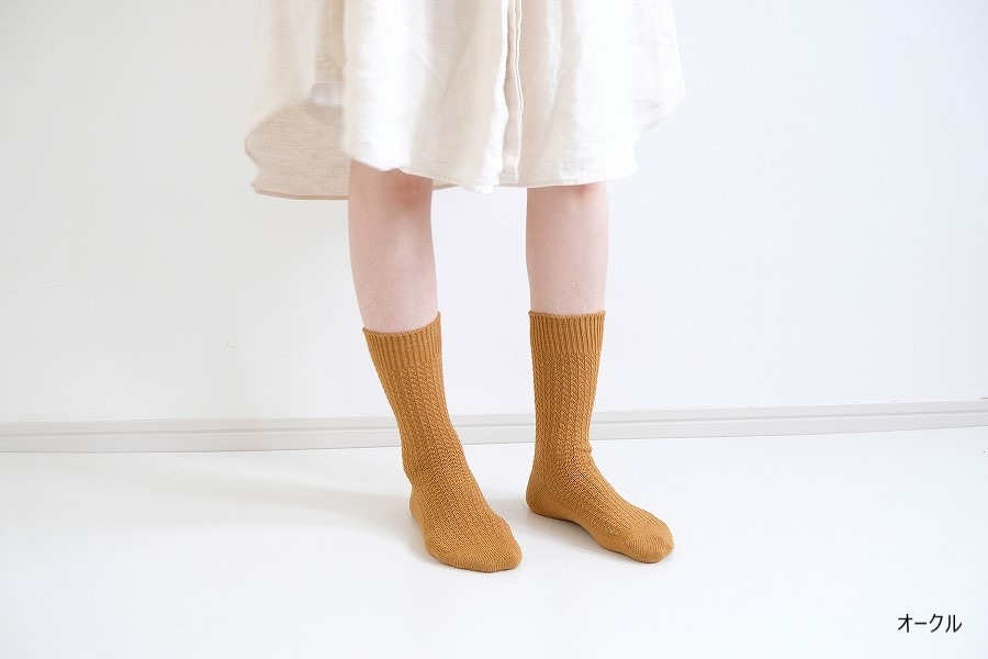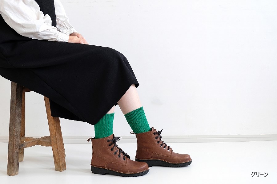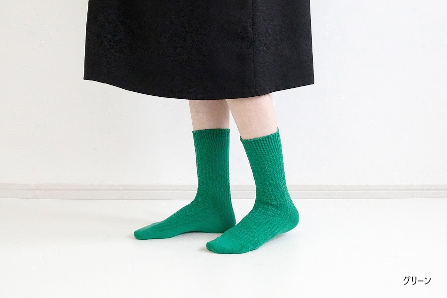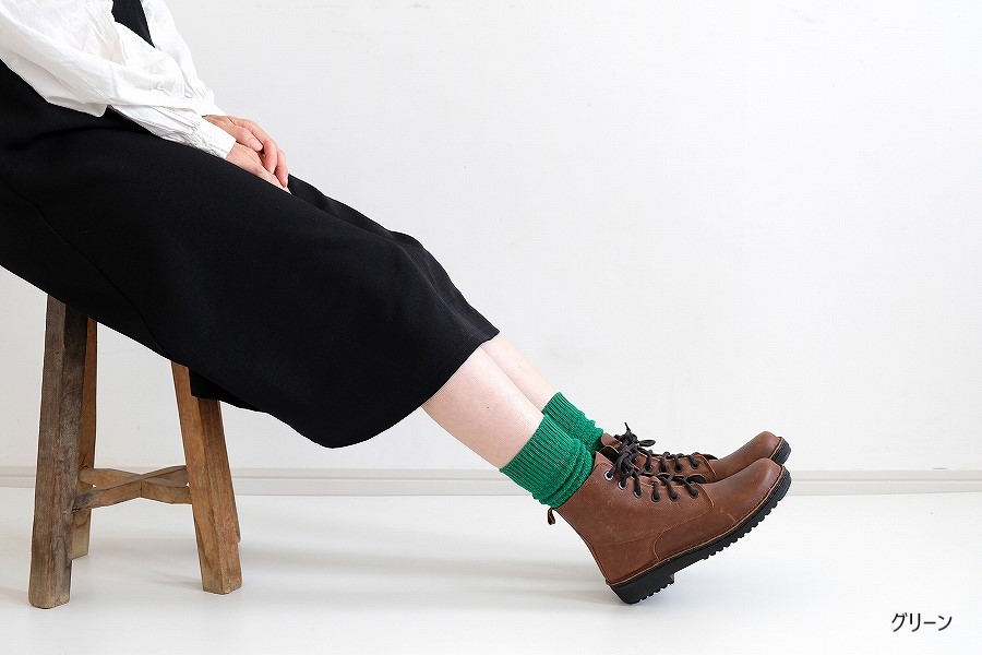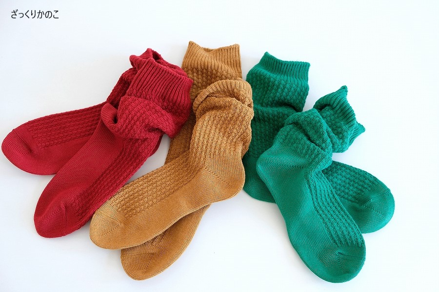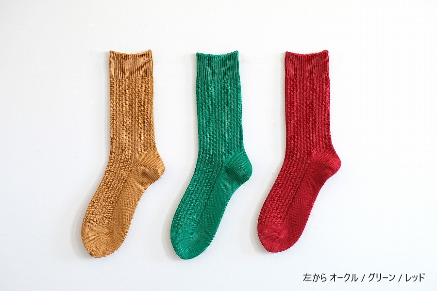足元のポイントになるような、落ち着いたオークル、明るめのグリーン、こっくりとしたレッドの3色展開で、思わず全色買いをしたくなるような靴下です。
