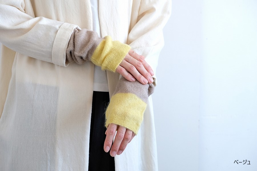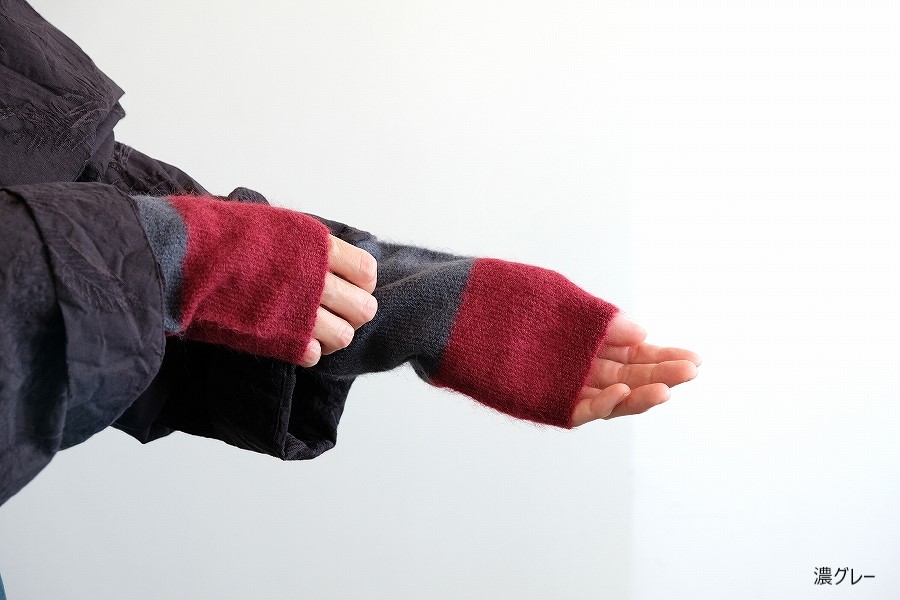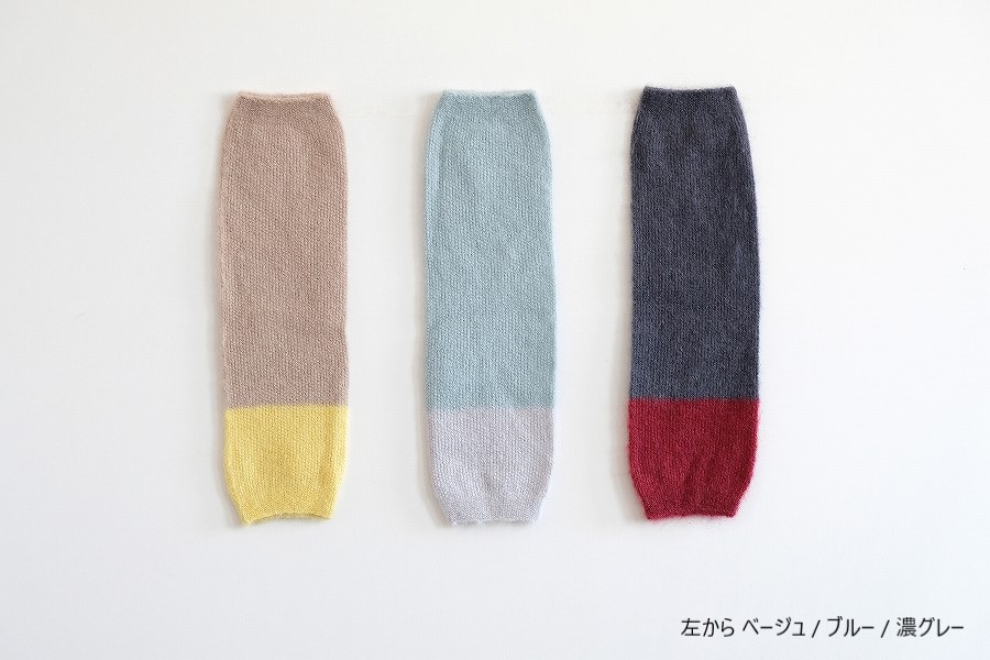無縫製の筒状タイプで、手の甲まであたたかく、袖口でモコモコしない薄手仕様で編み立てました。